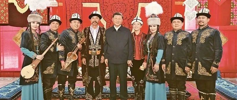 2022年7月12日至15日,中共中央总书记、国家主席、中央军委主席习近平在新疆考察。这是13日上午,习近平在乌鲁木齐市新疆维吾尔自治区博物馆,同《玛纳斯》非物质文化遗产传承人在一起。 新华社记者 谢环驰/摄