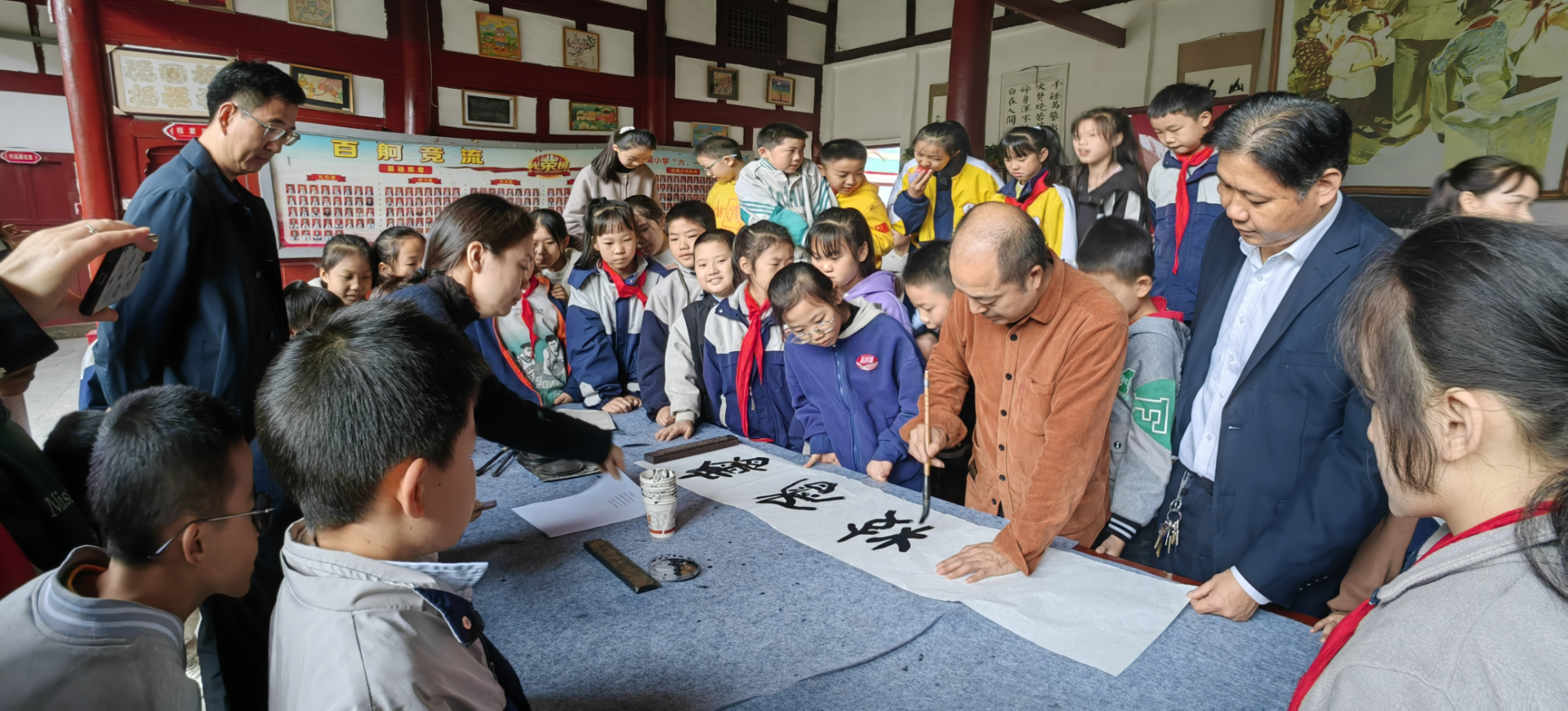 上午9时,仪陇县书法家协会会员胡灵、钟海榕给学生带来了一场别开生面的书法课堂教学。县书协老一辈书法家林学远,一级美术师、县书协主席许棚,中国书协会员谢秀梅,县书协会员王龙、邓艳等分别为学生现场展示了书法艺术。一幅幅书法作品让师生们大开眼界,领略了中国书法艺术的魅力。随后,许棚为金粟书院题了楹联匾额。