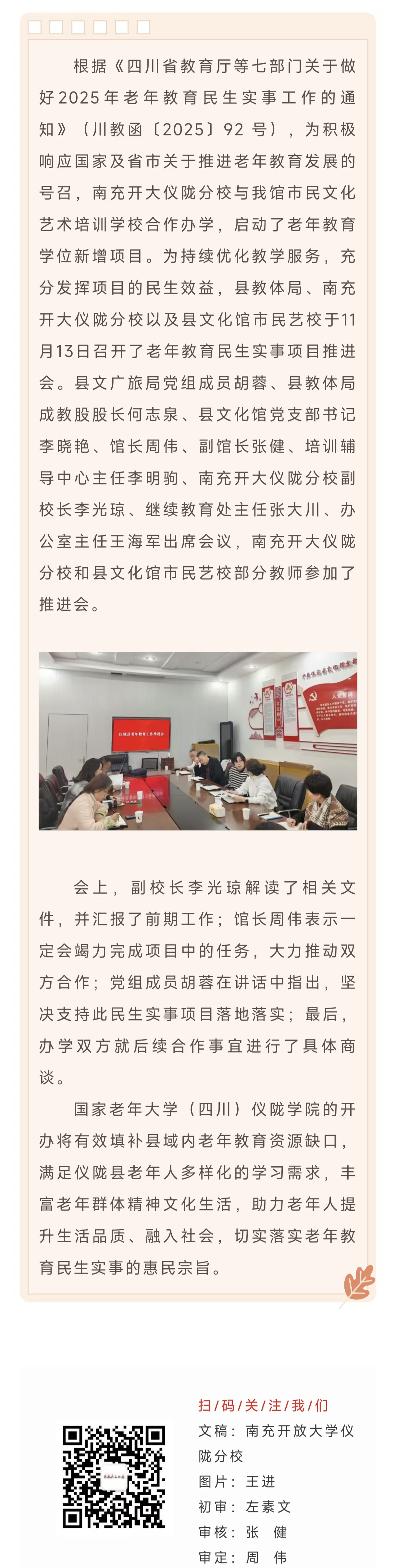 仪陇县教育和体育局联合南充开放大学仪陇分校、仪陇县文化馆召开2025年老年教育民生实事项目推进会