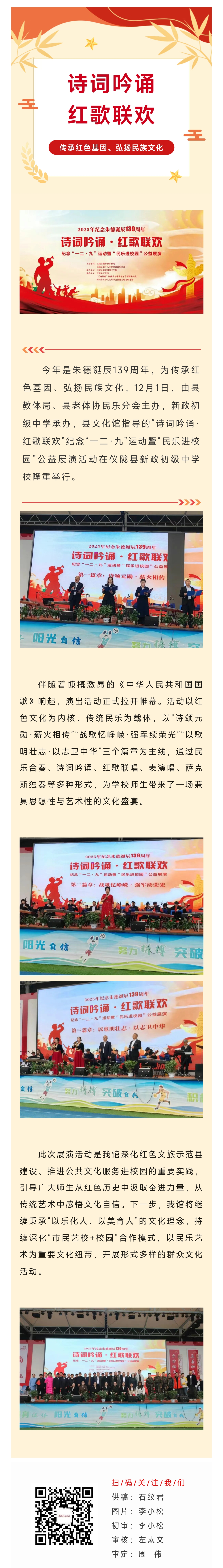 “诗词吟诵·红歌联欢”纪念“一二·九”运动暨“民乐进校园”公益展演活动在新政初级中学隆重举行